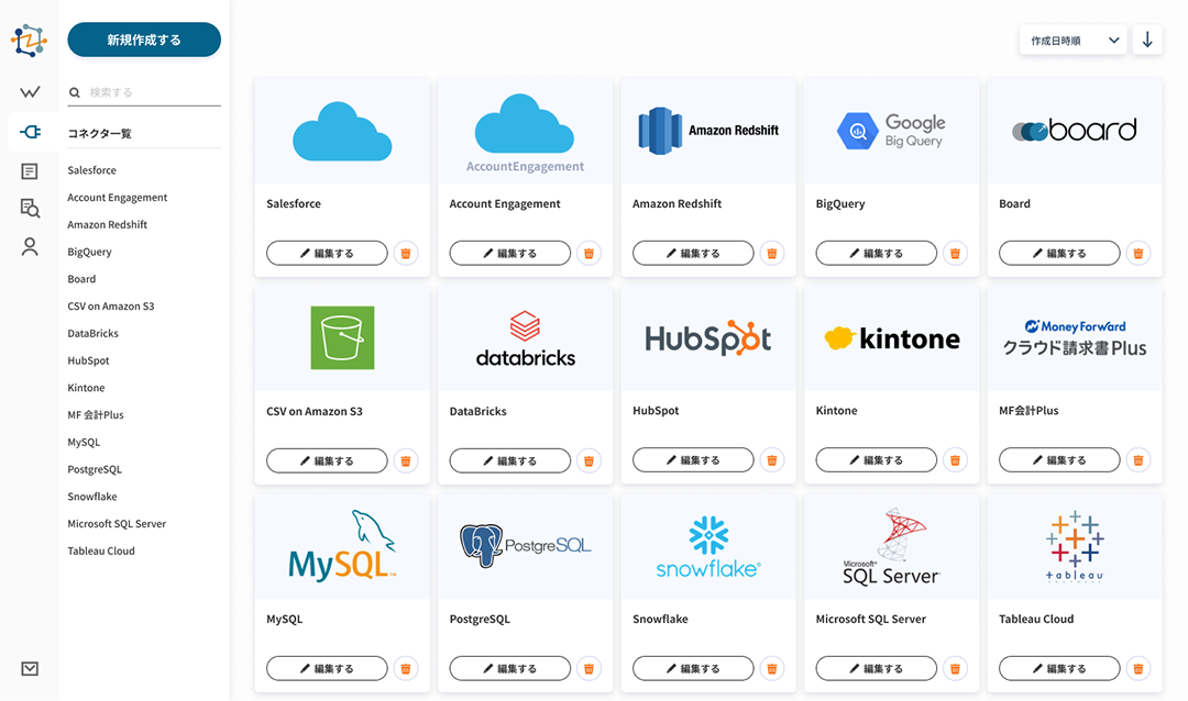 日本企業で広く利用されているSalesforce、freee会計、kintone、HubSpot、Tableau、Google Sheets、Amazon S3など、実際の業務現場で使用頻度の高いシステムを中心にコネクタを開発。毎月新しいコネクタを追加し、対応範囲を拡大しています。