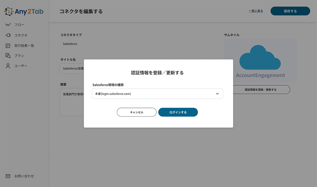 複雑なAPI設定や技術的な知識は不要です。各システムのユーザー名やパスワード、APIキーなどの認証情報を指定の項目に入力するだけで、Any2Tabが自動的に接続処理を実行。面倒な設定作業なしに、すぐにデータ連携を開始できます。