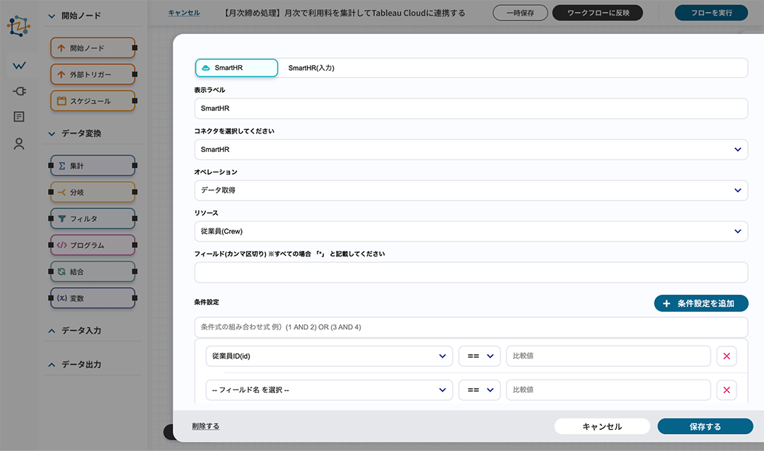 「今月の売上データのみ取得」「顧客名と会社名を結合して表示名を作成」といった動的な条件設定や文字列操作も直感的に設定可能。カレンダー機能や数式エディタを使って、柔軟なデータ処理ルールを簡単に作成できます。