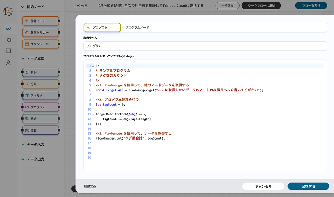 Node.js・JavaScriptによる記述で、複雑なデータ加工処理に対応可能