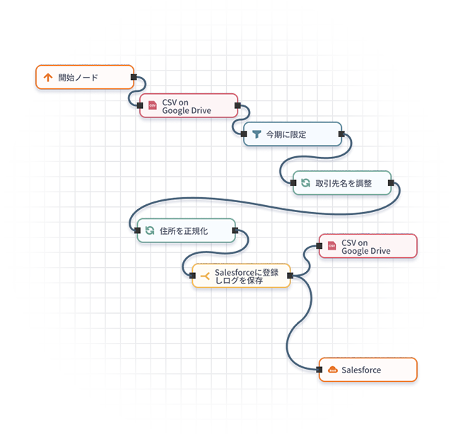 複数のデータソースからの情報を結合したり、売上データを月別に集計したり、条件に応じて処理を分岐させたりといった高度なデータ加工も、プログラミング不要で実現できます。プリセットされた処理ノードを組み合わせるだけで完成します。