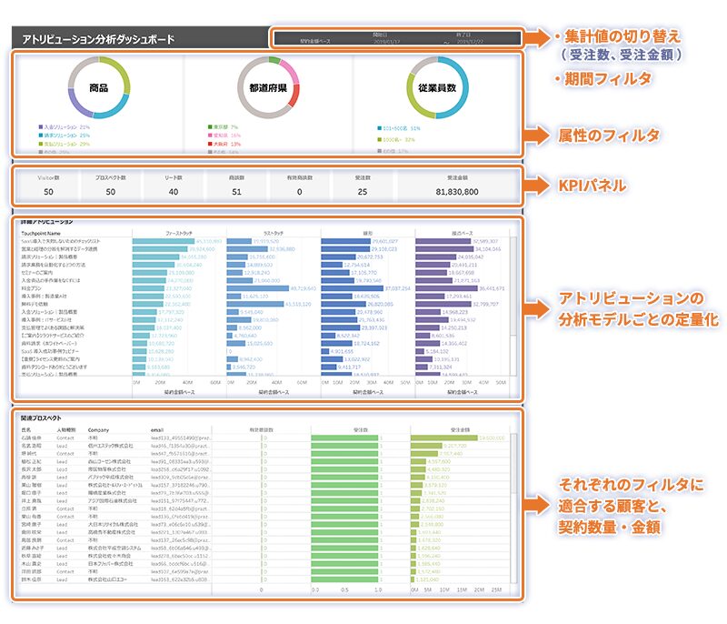 それでは、実際のアトリビューション分析ダッシュボードの構成要素と使用方法を詳しく見ていきましょう。このダッシュボードは、マーケティング部門の方々が、受注や売上につながる顧客獲得・クロージングに有効なマーケティング施策を特定するために設計されています。