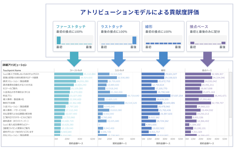 見込み顧客が最初に接触したコンテンツから最終的な受注に至るまでには、複数のタッチポイントが存在します。メルマガ、ホワイトペーパー、セミナー、製品デモ——これらの施策が受注にどの程度貢献したのかを正確に把握できなければ、マーケティング投資の最適化は困難です。
