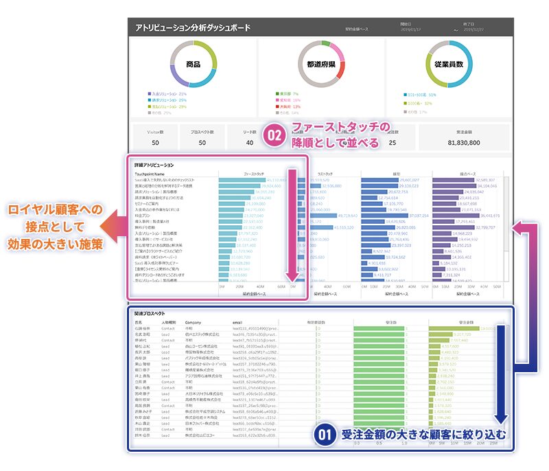 実際のダッシュボードの使用例をご紹介します。下図では、受注金額の降順でソートし、上位セグメントで絞り込んだ状態で、さらにファーストタッチの降順で並べ替えています。これにより、受注金額が大きいセグメントの顧客層が、どの施策を起点に獲得されたのかを明確に把握できます。