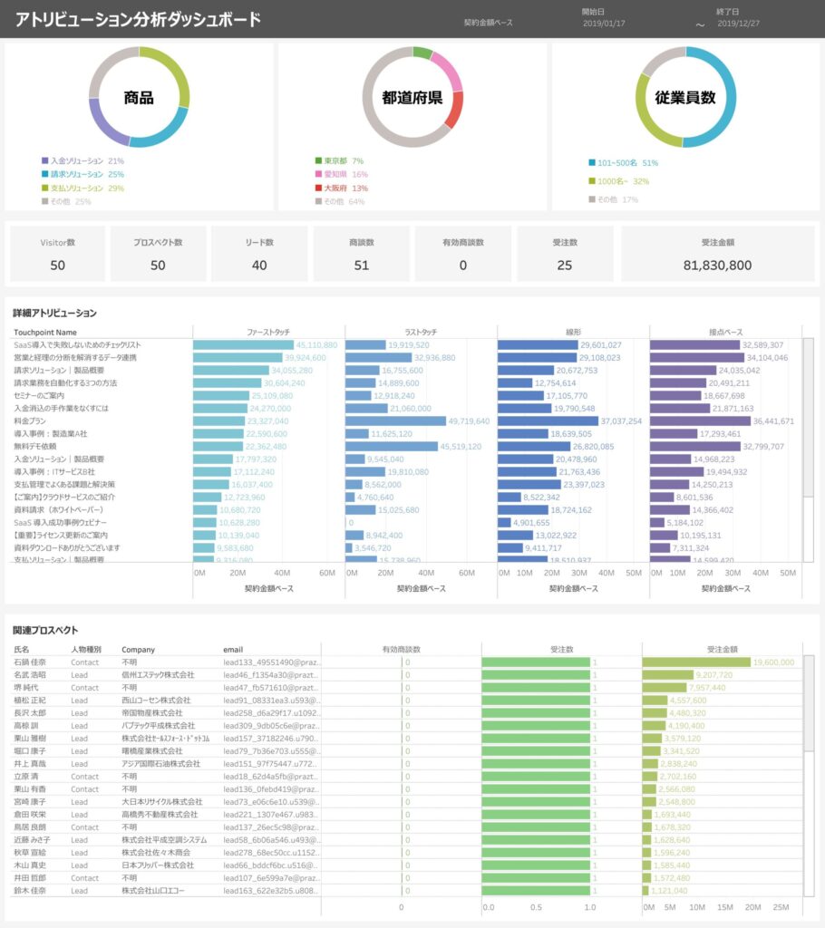 まず、今回ご紹介するダッシュボードをご覧ください。このダッシュボードを活用すれば、各マーケティング施策が受注金額や受注数にどの程度貢献しているかを正確に把握できます。