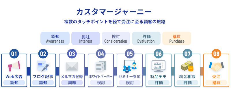 顧客はカスタマージャーニーの中で複数のタッチポイントを経て受注に至ります。アトリビューション分析とは、受注金額を各タッチポイントに按分し、どの施策にどれだけの成果を帰属させるかを明らかにする分析手法です。