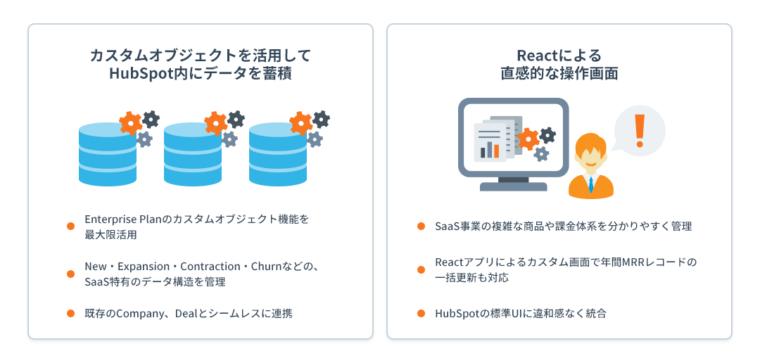 会社や取引などの標準オブジェクトを最大限に活用し、その延長として、MRRやサブスクリプション商品などのカスタムオブジェクトを活用。そのため、現在のHubSpot管理の自然な延長としてSaaS Upを活用することが可能です。