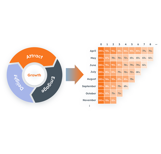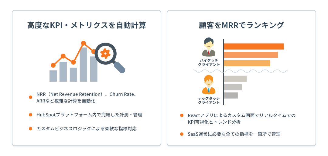 NRR(Net Revenue Retention)、Churn Rate(解約率)、New・Expansion・Contraction・ChurnなどのMRRの詳細な分析、その他SaaS運営に必要な指標を自動計算。SaaS KPIの複雑な計算を自動化し、HubSpotプラットフォーム内で完結した計測・管理を実現。リアルタイムKPI更新とトレンド分析により、データに基づいた迅速な経営判断が可能になります。