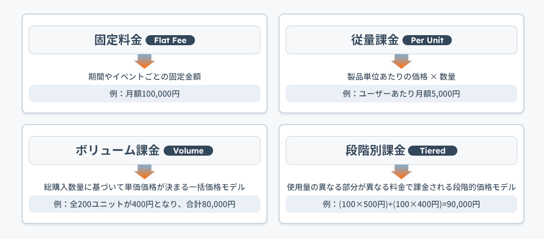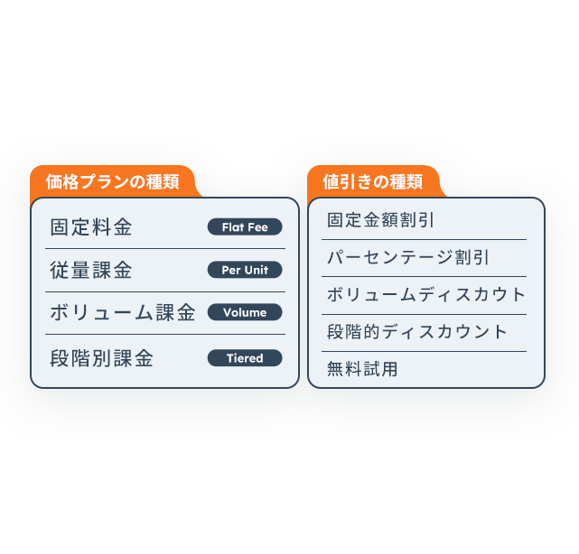 固定料金、従量課金、ボリューム課金、段階別課金の4つの価格プランを標準装備し、あらゆるSaaSビジネスモデルに対応。固定料金は期間やイベントごとの定額課金、従量課金は利用量に応じた柔軟な課金、ボリューム課金は総購入数量に基づく一括価格モデル、段階別課金は使用量の異なる部分を異なる料金で課金する段階的価格モデルを実現します。複数の価格プランを組み合わせることで、基本料金+従量課金といった複合的な料金体系も設定可能。実際のビジネスモデルに即した正確な収益管理を実現します。