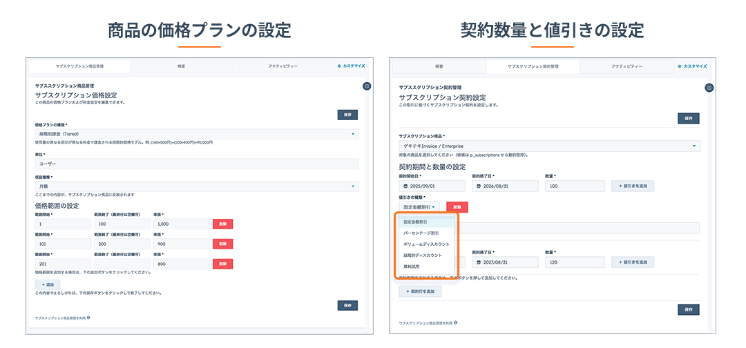 複雑な価格プランや段階的な料金設定も、直感的なReact画面で簡単に設定可能。HubSpotの標準UIに違和感なく統合されたカスタム画面により、専門知識がなくても誰でも操作できます。固定料金、従量課金、ボリューム課金、段階別課金の選択から、各段階の数量範囲と単価設定まで、すべてビジュアルで確認しながら設定。設定内容がリアルタイムでプレビューされるため、ミスや設定漏れを防止。エンジニアに依頼することなく、営業やカスタマーサクセス担当者自身が料金体系を管理・更新できます。